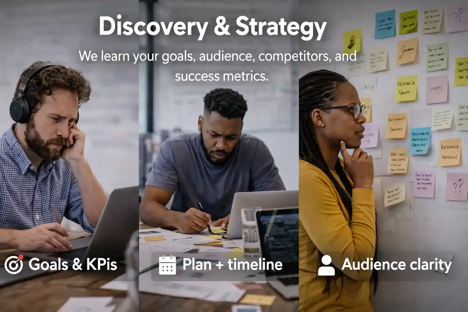 We learn your goals, audience, competitors, and success metrics.